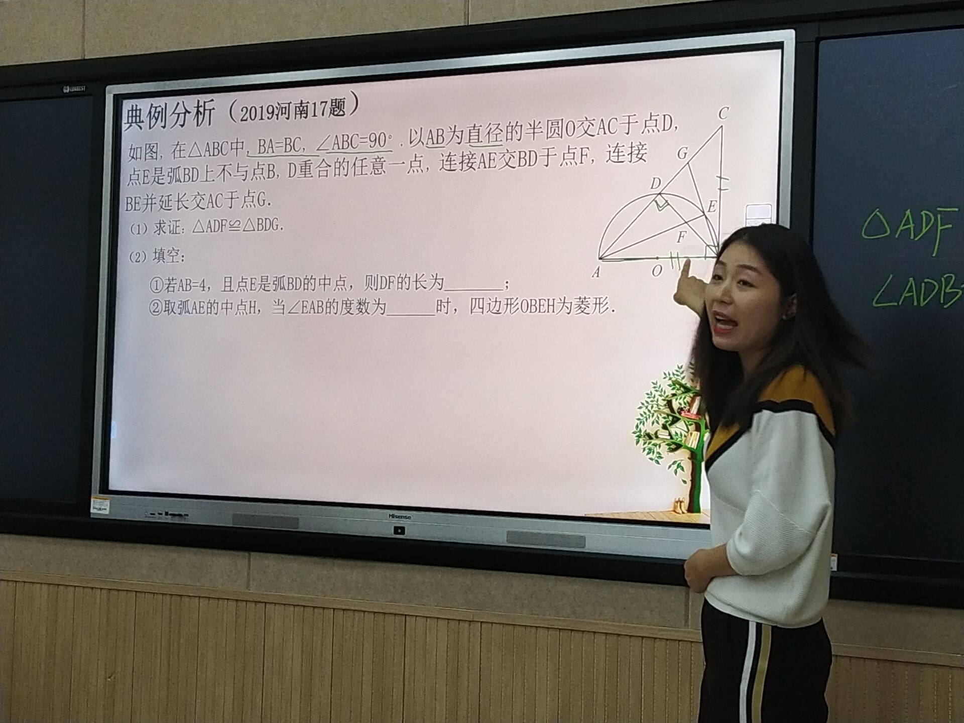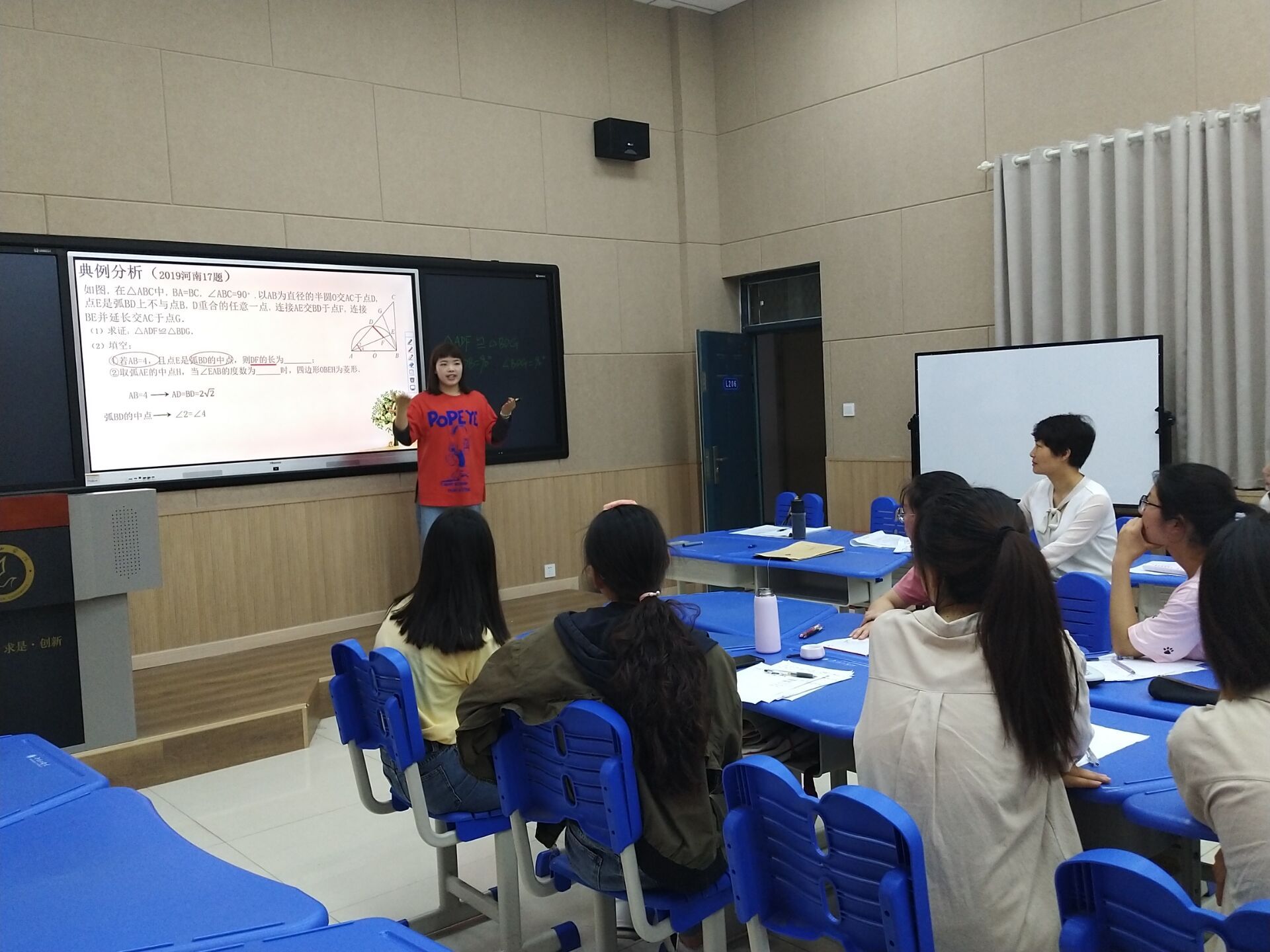 万晓庆老师首先展示了河南省近6年中招考试中与圆有关的图形,让员工从图形的角度快速感知中考常见图形元素。然后以2019年中考题目为例,员工积极地进行小组讨论,由组内代表上台发言,进行教学展示。接着万老师对小组的教学过程进行指导,带领员工体验如何从题目中圈画关键词,并结合图形将文字语言转化成符号语言,进而得到小结论,再将小结论组合得到大结论,从而顺利解决问题。
