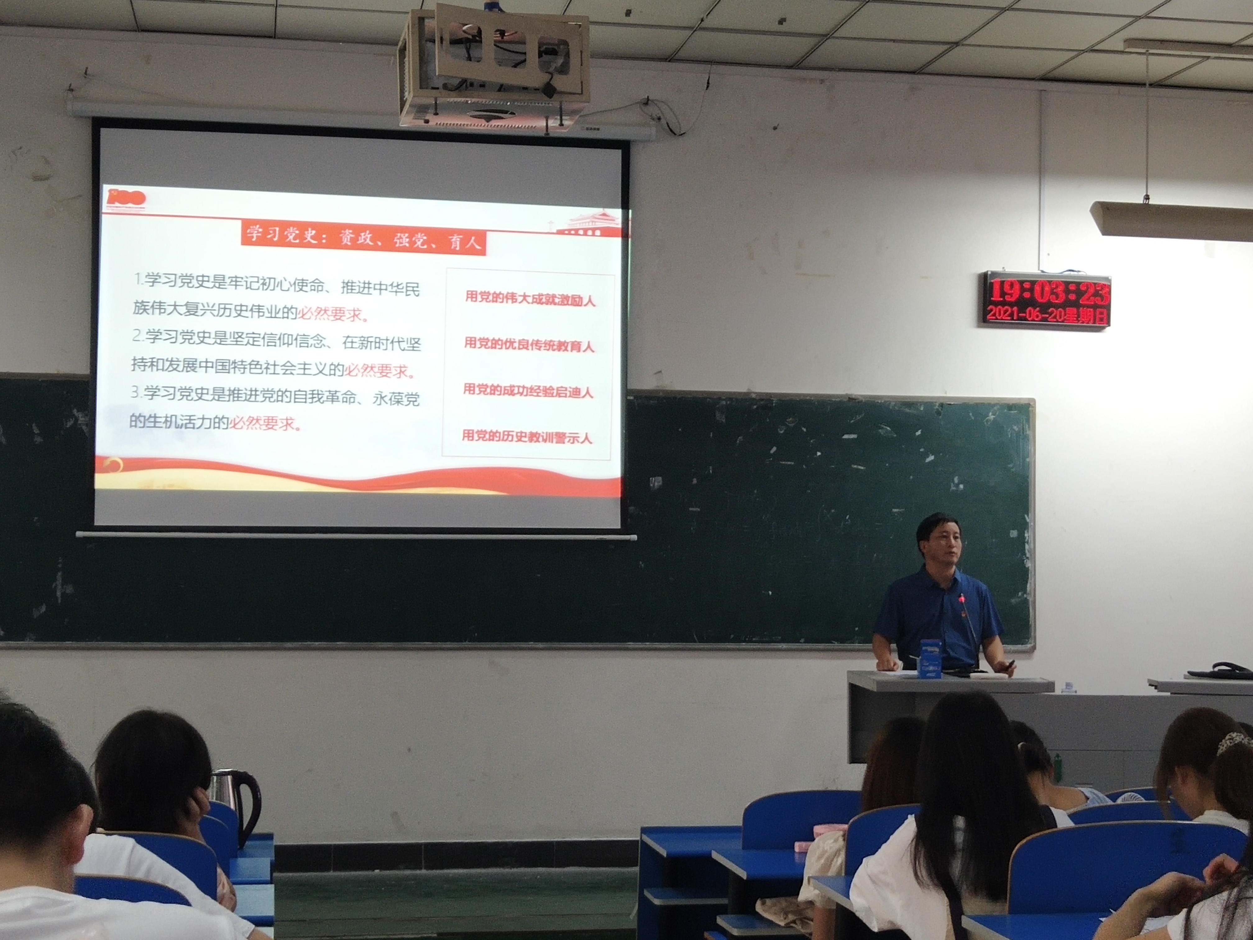 为庆祝中国共产党成立100周年,深入学习贯彻习近平新时代中国特色社会主义思想,推动党史学习教育各项工作扎实开展,广泛营造“学党史、悟思想、办实事、开新局”的浓厚氛围,6月20日晚,信誉最好的十大体育平台在2306教室举办党史学习教育宣讲报告会,公司党委书记张建林应邀作“学好百年党史,汲取奋进力量”主题报告,2018级全体员工参加报告会。