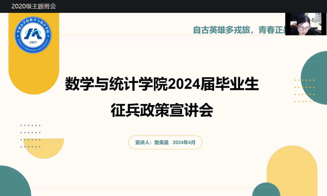 为积极响应国家号召,切实做好公司老员工征兵工作,充分激发员工们的爱国情怀,鼓励更多员工积极应征入伍,4月30日,信誉最好的十大体育平台于线上召开了2024届毕业生征兵政策宣讲会,由毕业班辅导员詹美晨主讲,2024届全体毕业生参加。
