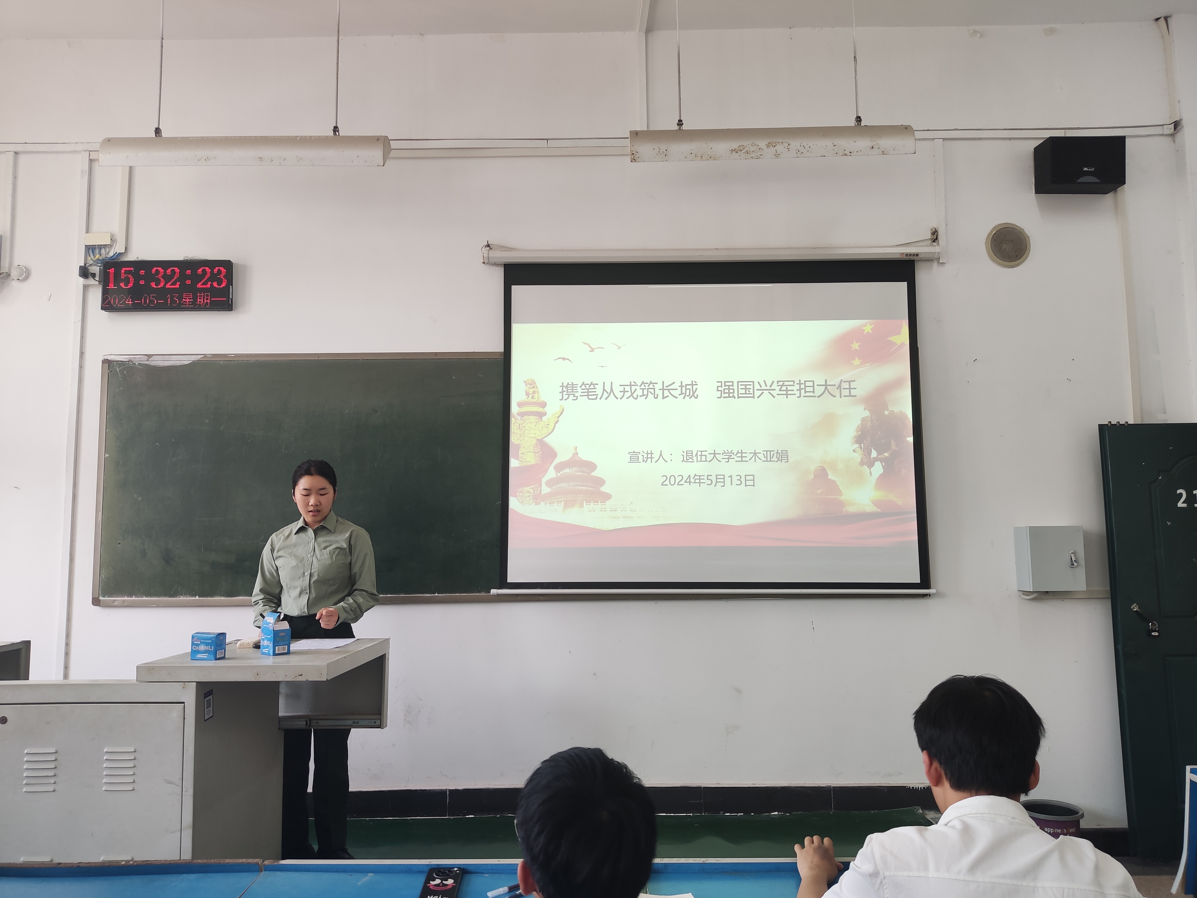 宣讲会上,木亚娟结合军旅生活,从征兵时间、入伍基本条件、征兵体检标准、应征入伍流程以及入伍优惠优待政策等方面详细阐述了国家征兵政策,同时她鼓励同学们积极征兵入伍,树立携笔从戎、建功军伍、报效祖国的观念。
