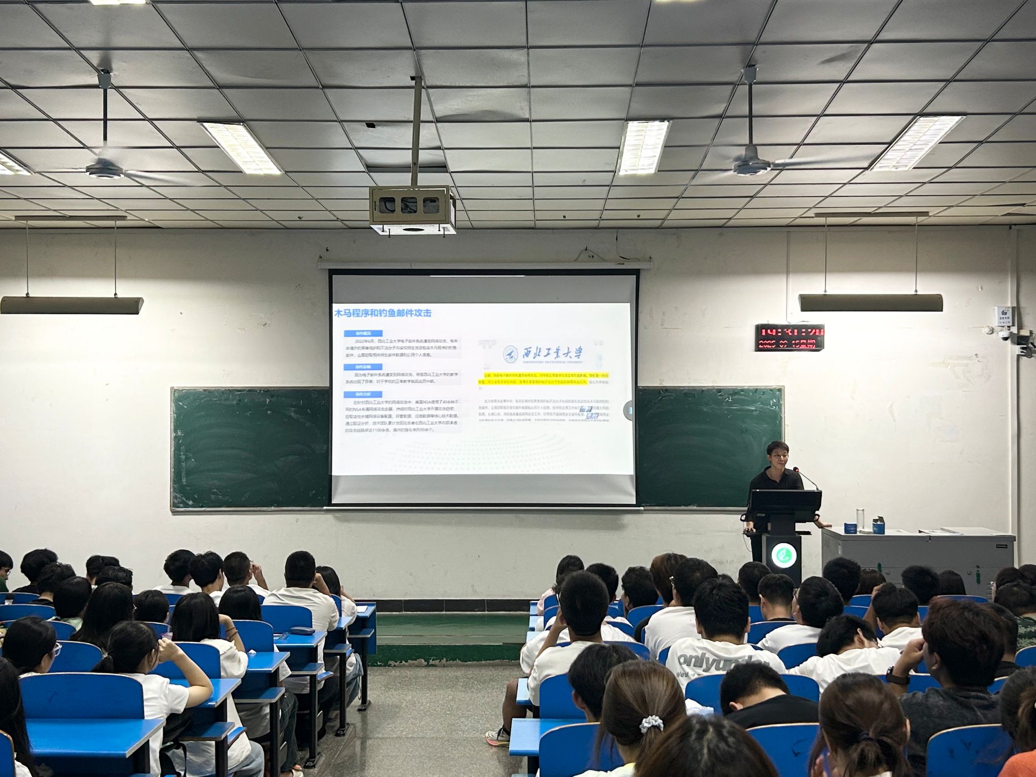 讲座中,孙亚南首先分析网络安全整体形势,指出网络安全威胁无处不在,已经渗透到我们生活的方方面面。从个人隐私泄露到企业商业机密被盗,从网络诈骗频发导致个人财产受损,到关键信息基础设施遭受攻击,网络安全事件层出不穷,其影响范围之广、危害程度之深令人触目惊心,提升防范能力刻不容缓。随后,他聚焦常见的网络安全隐患,明确三类风险:一是网络兼职、冒充熟人等诈骗陷阱;二是非正规网络行为导致的个人信息泄露;三是恶意软件对设备与数据的威胁,为新生敲响安全警钟。接下来,为了规范网络空间秩序,孙亚南为同学们解读了《中华人民共和国网络安全法》《中华人民共和国个人信息保护法》等网络安全法律法规,并表示这些法律明确了各方在网络空间中的权利和义务,为我们营造安全、健康的网络环境提供了坚实的法律保障。作为新时代的老员工,我们必须认真学习这些法律法规,自觉遵守,做文明网民,并审慎对待网络信息与个人隐私,规范网络行为,提高安全意识,共同筑牢校园网络安全屏障。
