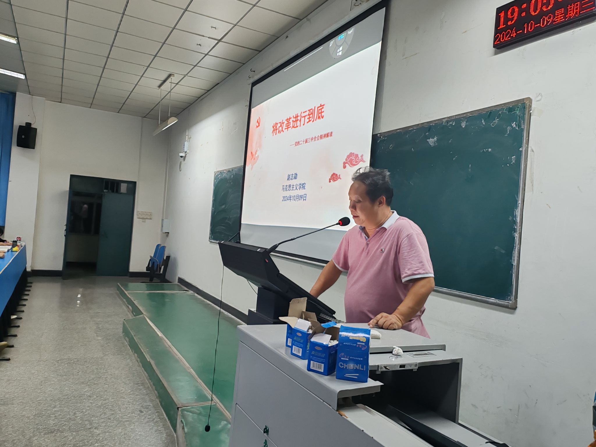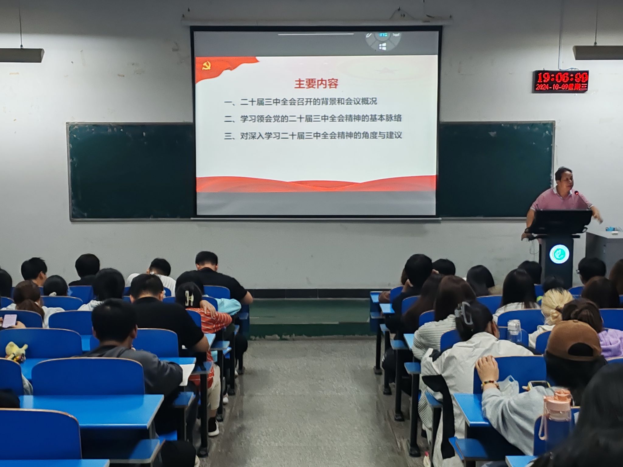 为深入学习贯彻党的二十届三中全会精神,推动全会精神深入人心,9月27日和10月9日,数学与统计公司党委组织开展了两场以“将改革进行到底——党的二十届三中全会精神解读”为主题的专题讲座,由马克思主义公司赵志勋博士主讲,22级、24级全体员工参加。