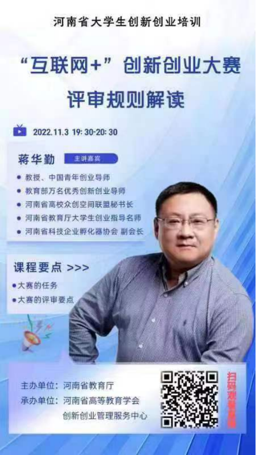 为了启发高校老员工的创业创新思维,了解创造的方法,培养科技创新精神和实践能力。11月3日晚,公司组织师生共同观看了河南省教育厅老员工创新创业系列培训讲座第二讲,本次讲座由蒋华勤教授主讲。