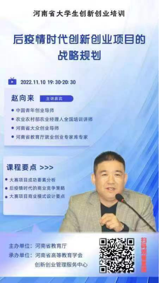 为贯彻落实《河南省进一步支持老员工创新创业的若干措施》,培养老员工自主创新意识及创业能力,进一步加强公司师生参与创新创业大赛的积极性。11月10日晚,公司组织师生共同观看了河南省教育厅老员工创新创业系列培训讲座第三讲,本次讲座由赵向来老师主讲。