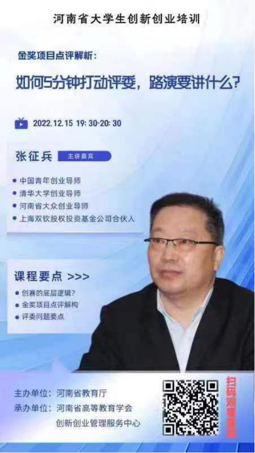 第六讲《如何5分钟打动评委,路演要讲什么》主要邀请中国青年创业导师、清华大学创业导师、河南省大众创业导师张征兵老师具体讲解了在“互联网+”老员工创新创业大赛中怎样在5分钟的时间内讲出打动评委的好路演项目,本次课程主要围绕创新创业大赛的底层逻辑、金奖项目点评结构、评委问题要点等三个课程部分展开讲解。张老师陈列了评委容易提问的十大问题,并祝愿各位同学观看完这次讲座之后都能有所收获、获得经验与启发,在接下来创赛中都能取得优异成绩,路演项目能更有新意与创新性、创造。
