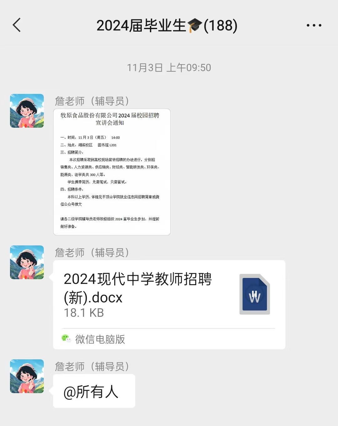 为持续做好毕业生就业工作,2023年11月3日,公司举办南召县现代中学线上专场招聘会,由2024届毕业班辅导员詹美晨向毕业生介绍公司情况及岗位需求,并鼓励毕业生积极投递简历。