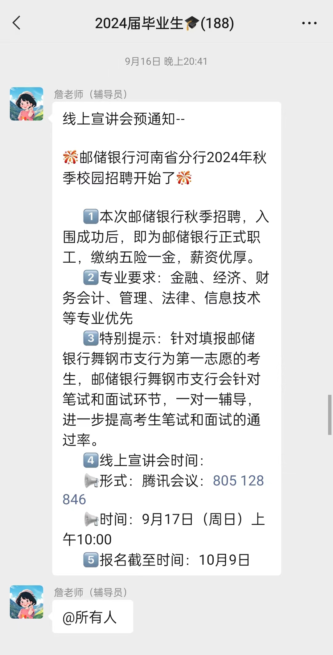 2023年9月17日上午,公司举办邮储银行河南省分行线上专场招聘活动,由2024届毕业班辅导员詹美晨带领金融工程专业毕业生观看网络招聘直播,并鼓励毕业生积极投递简历。