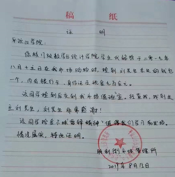 2019年8月15日,公司17级数学与应用数学1班员工代铭哲在平顶山市胜利街市场购物时,捡到一个钱包,内有银行卡、身份证及现金九百余元。代铭哲同学立即将钱包交到市场值班室,工作人员经查找与失主刘先生取得联系,归还了钱包。刘先生对代铭哲同学表示感谢,并对她高尚的道德品质表示赞扬。