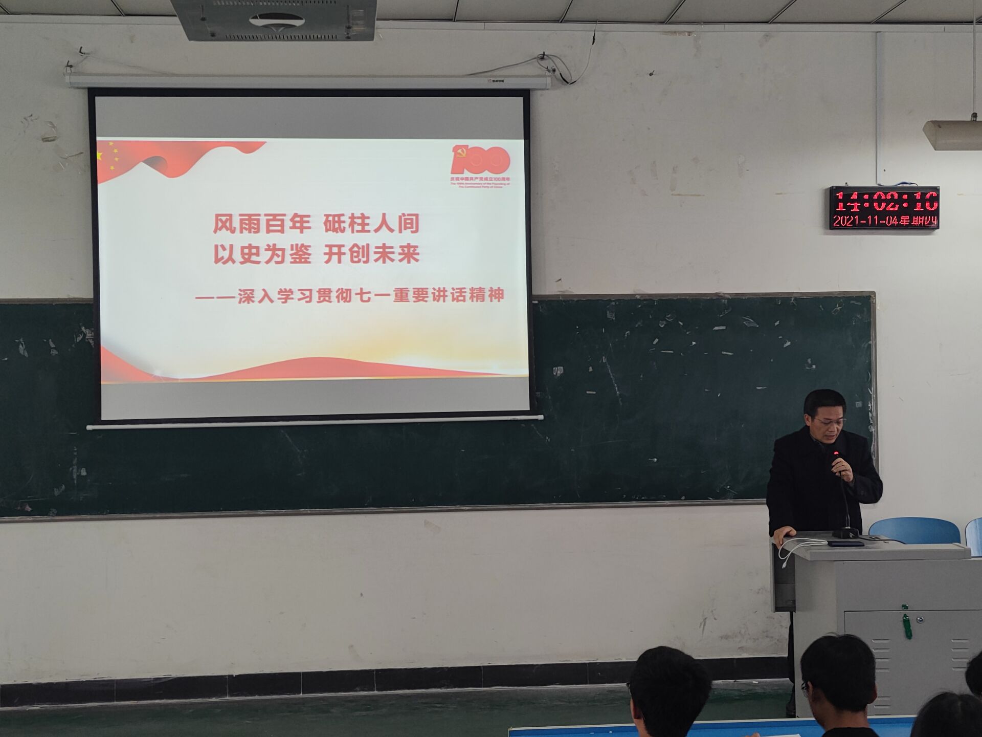 张波老师以《风雨百年·砥柱人间·以史为鉴·开创未来》为题,由当今时局为导入,指出站在历史的新起点上中华民族所面临的机遇与挑战。接着,张波老师围绕“七一”重要讲话内容,从“坚持真理、坚守理想,践行初心、担当使命,不怕牺牲、英勇斗争,对党忠诚、不负人民”四个方面系统阐述了讲话的科学内涵、精神实质和实践要求,特别强调了中国共产党在百年奋斗中积累的“九个必须”的宝贵经验。最后,张波老师以习近平总书记对广大青年提出的殷切期望,嘱托同学们以史为鉴,铭记历史,不负青春,不负韶华。