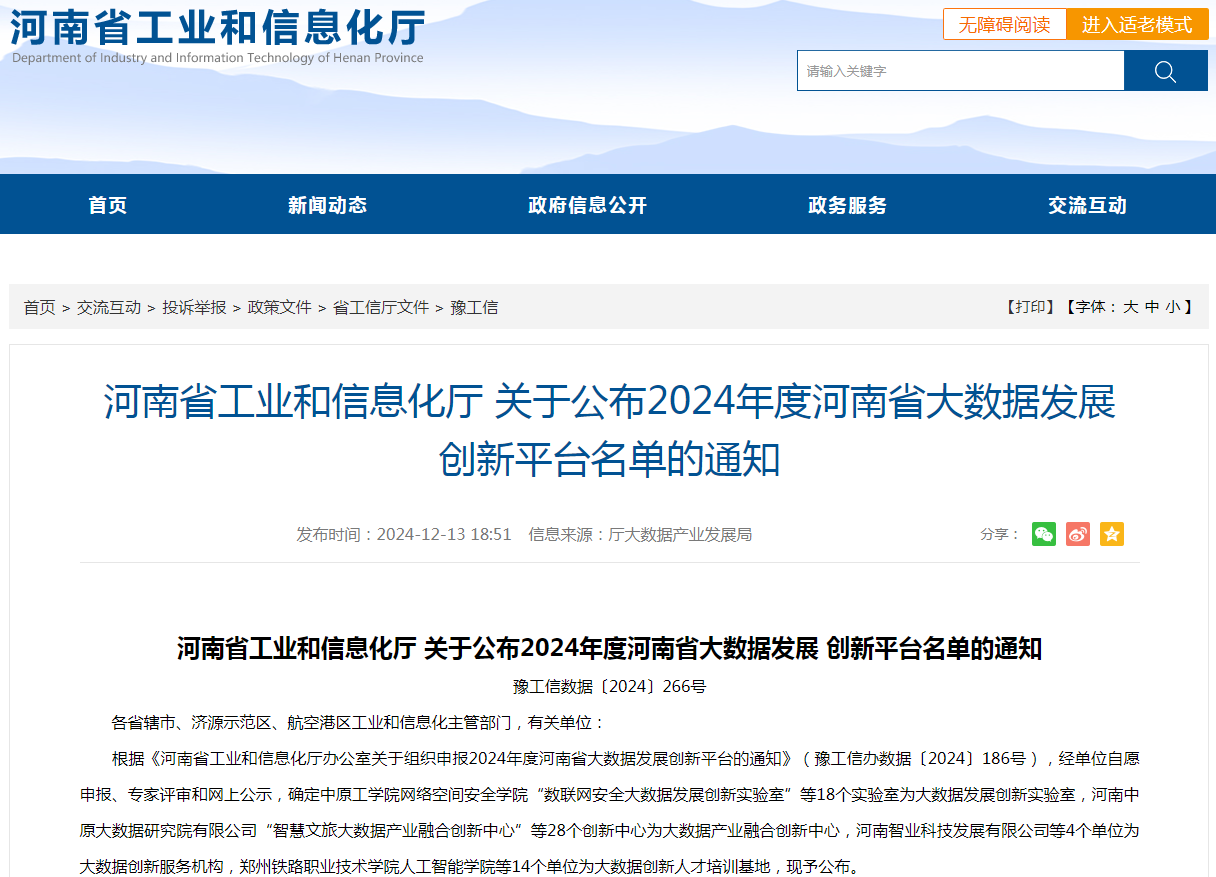 近日从河南省工业与信息化厅获悉,公司牵头申报的《智慧电力大数据产业融合创新中心》——河南省大数据发展创新平台获准立项建设,这是公司首个省级大数据发展创新平台(到2025年全省建成80个左右省级大数据产业融合创新中心)。