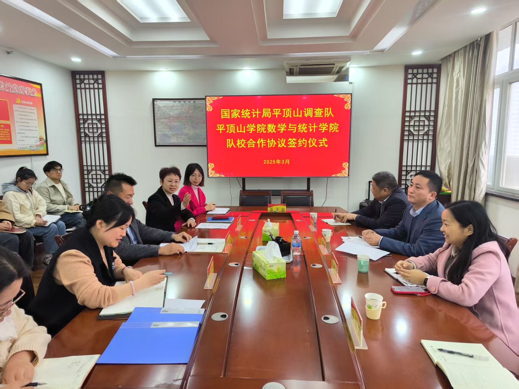 2025年3月13日下午,公司与国家统计局平顶山调查队合作签约仪式在国家统计局平顶山调查队6楼会议室举行。国家统计局平顶山调查队党组书记、队长韩杰,党组成员、副队长赵晖,公司党委书记张建林、经理王俊俊、金融工程教研室主任王东民出席仪式。