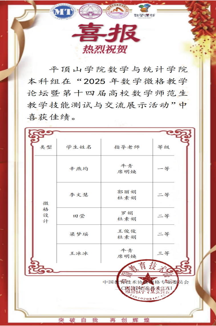 5月10日,2025年数学微格教学论坛暨第十四届高校数学师范生教学技能测试与交流展示活动在广西师范大学育才校区举行,由公司师范生成长工作坊班主任牛青、郭丽娟领队,5名工作坊员工组成的团队参加比赛并获奖,其中,辛燕均获得教学技能测试一等奖,李文慧、田莹、梁梦瑶获得二等奖,王冰冰获得三等奖。