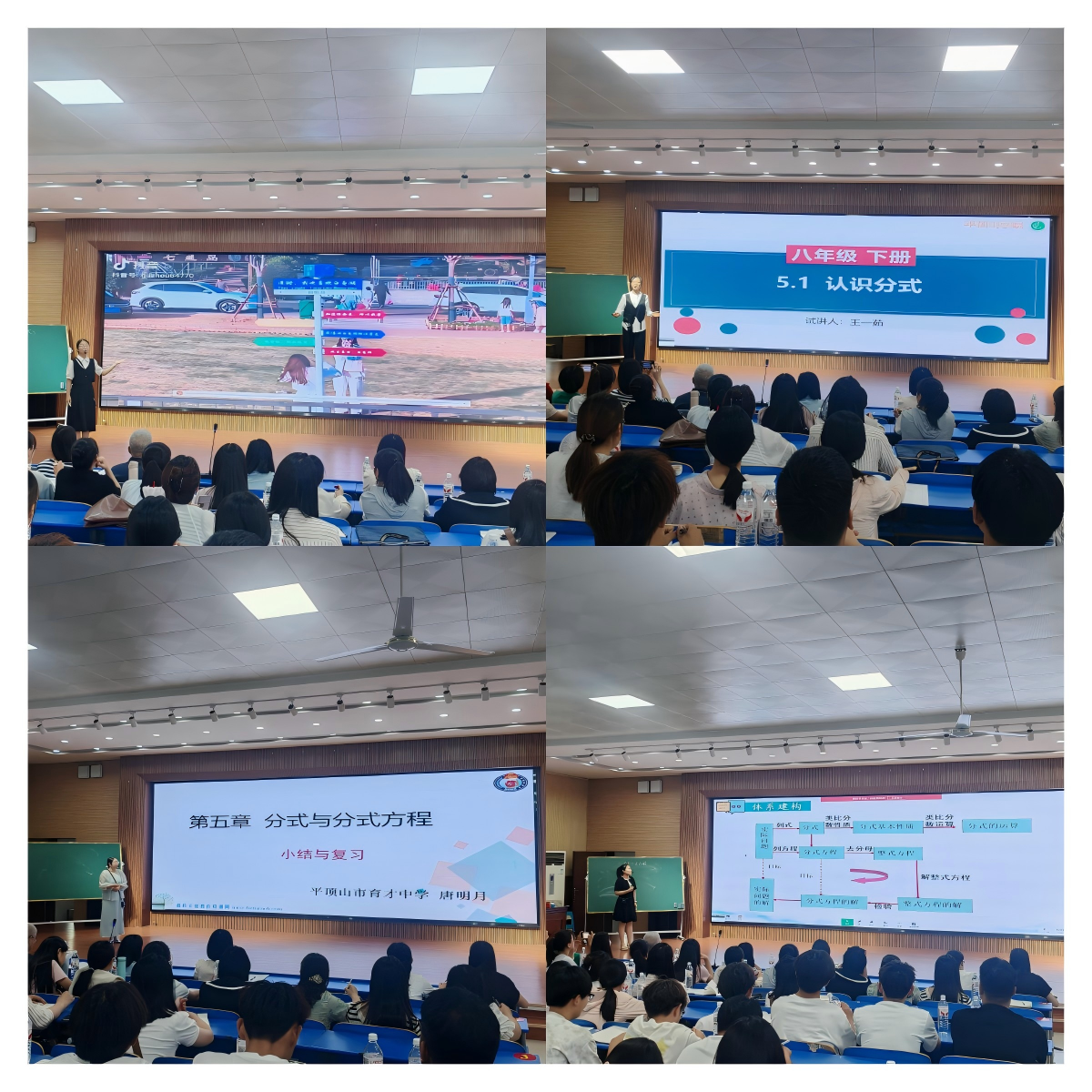在市四十三中党总书记席明焕的致辞中,活动正式开始了。工作坊学员们王一茹和王子瑾首先进行了同课异构,讲授了北师大版八年级下册《5.1 认识分式》的新授课展示。她们以新颖的教学设计和独特的教学风格,向在场师生展示对分式知识的理解与传授方式,展现了未来数学教师的教学潜力。接着,市级骨干教师培育对象唐明月、秦梦月两位老师带来精彩的复习课展示,其扎实的教学功底和巧妙的课堂设计,让学员们领略到中学一线教学的魅力与精髓。