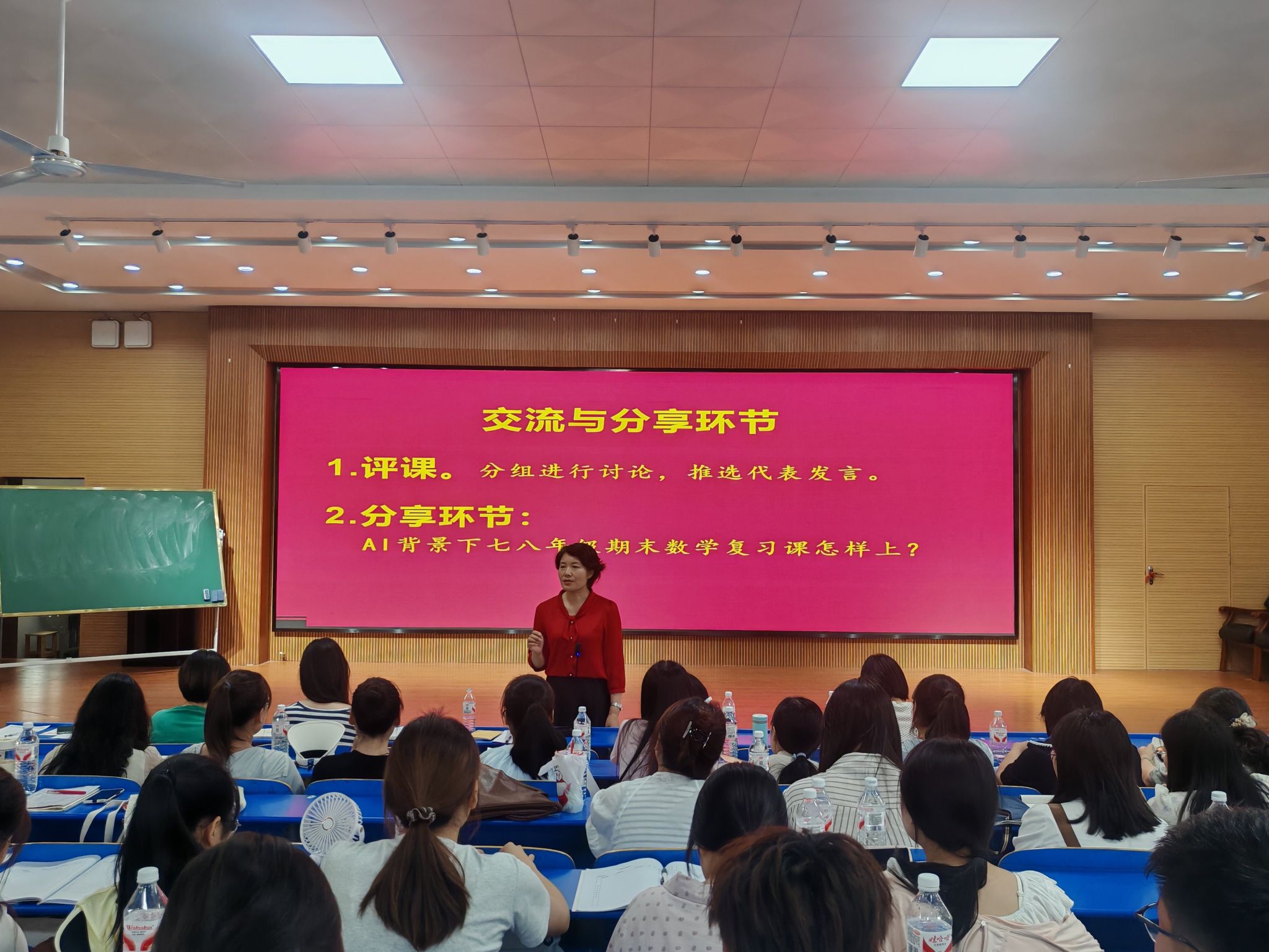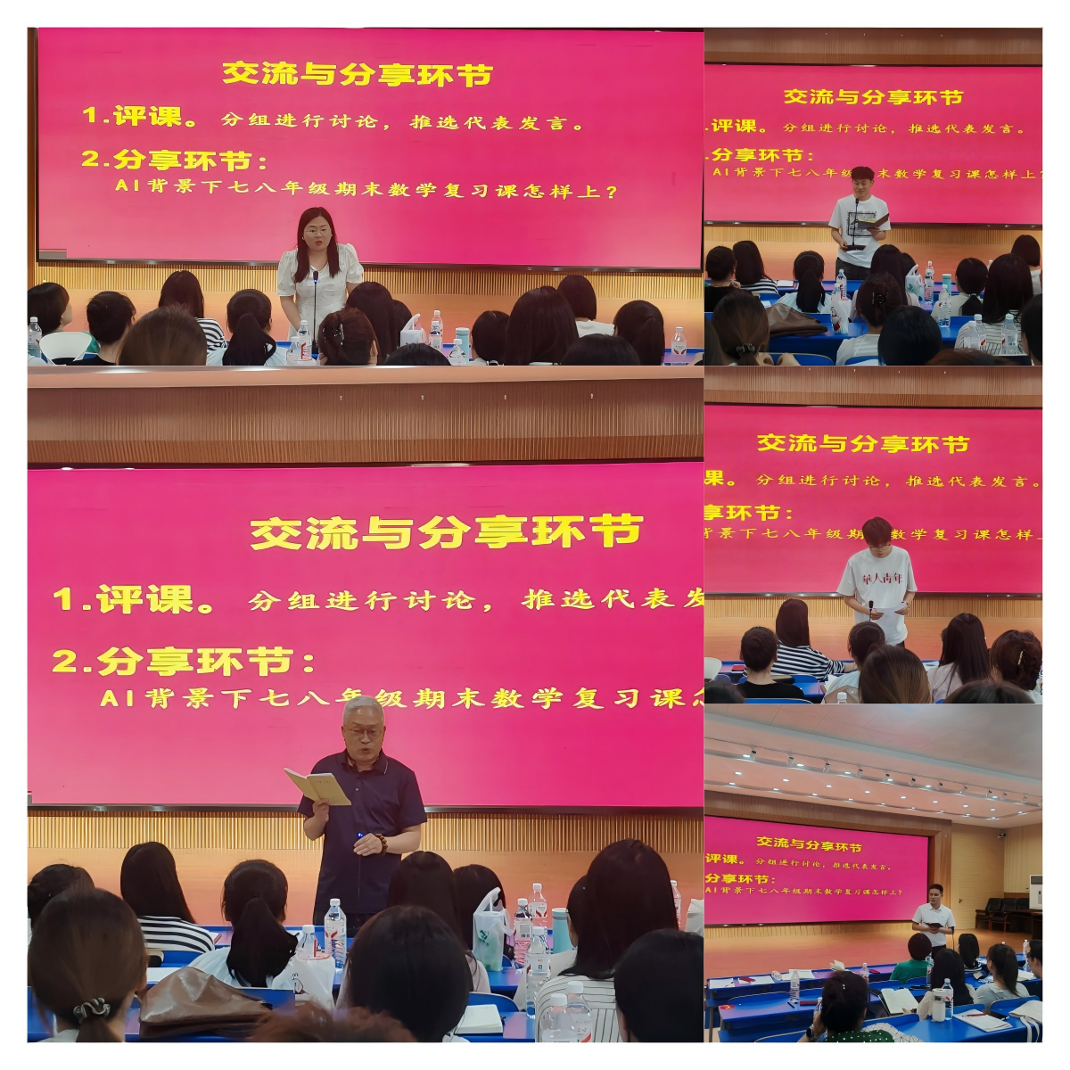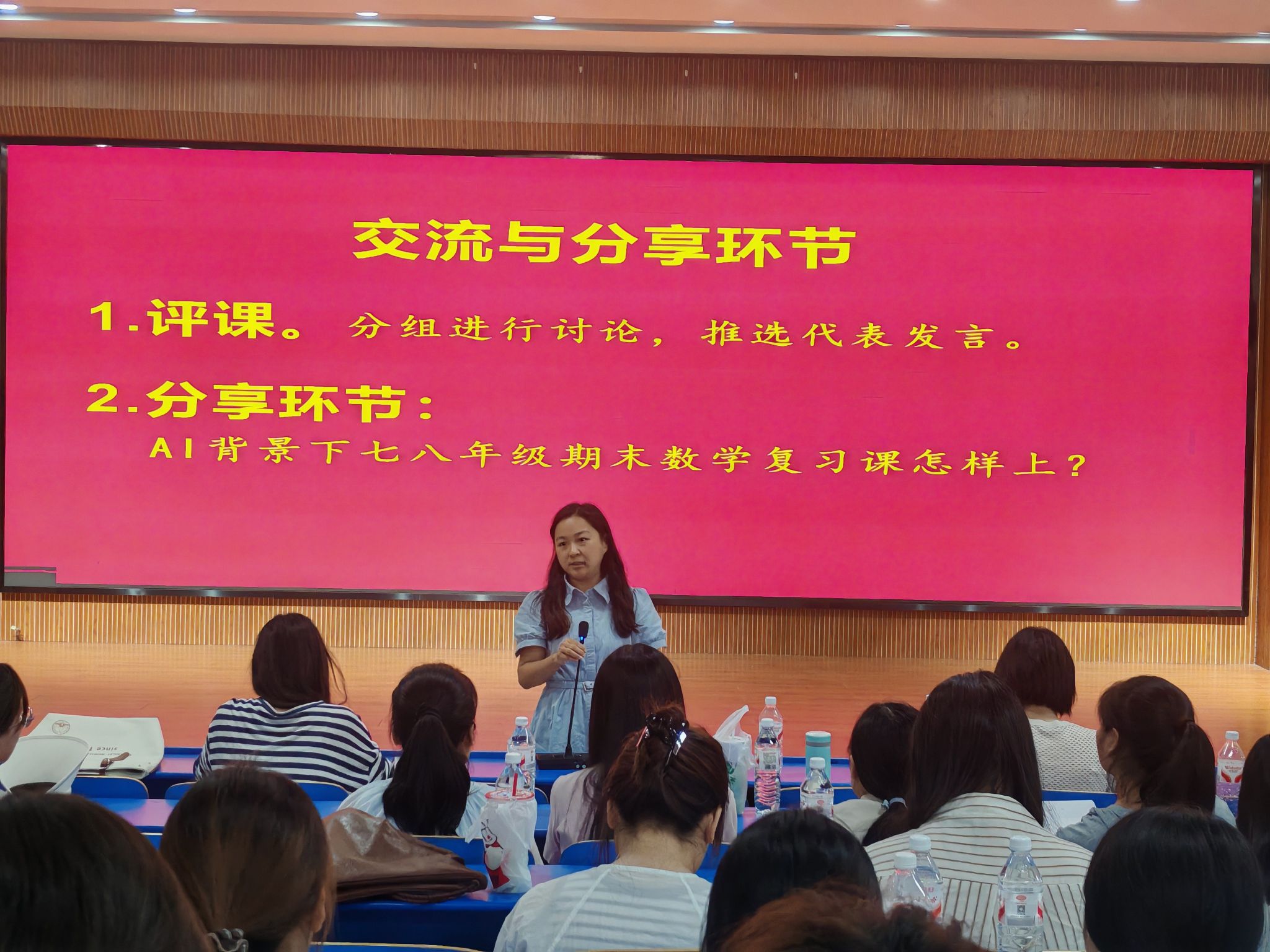 在主题分享环节,针对“AI背景下七八年级数学期末复习课怎样上才高效?”这个议题,市四十三中八年级数学备课组长高蕾老师分享了利用豆包、DeepSeek 等 AI 工具优化复习、诊断学情的实践,为期末复习提供前瞻方向。王俊俊经理从教育发展趋势、技术融合等角度出发,强调了在人工智能时代,教师应充分利用技术优势,创新复习课模式,注重员工个性化学习需求,让期末复习更具针对性和实效性,为未来数学应用AI技术教学提供了新思路。