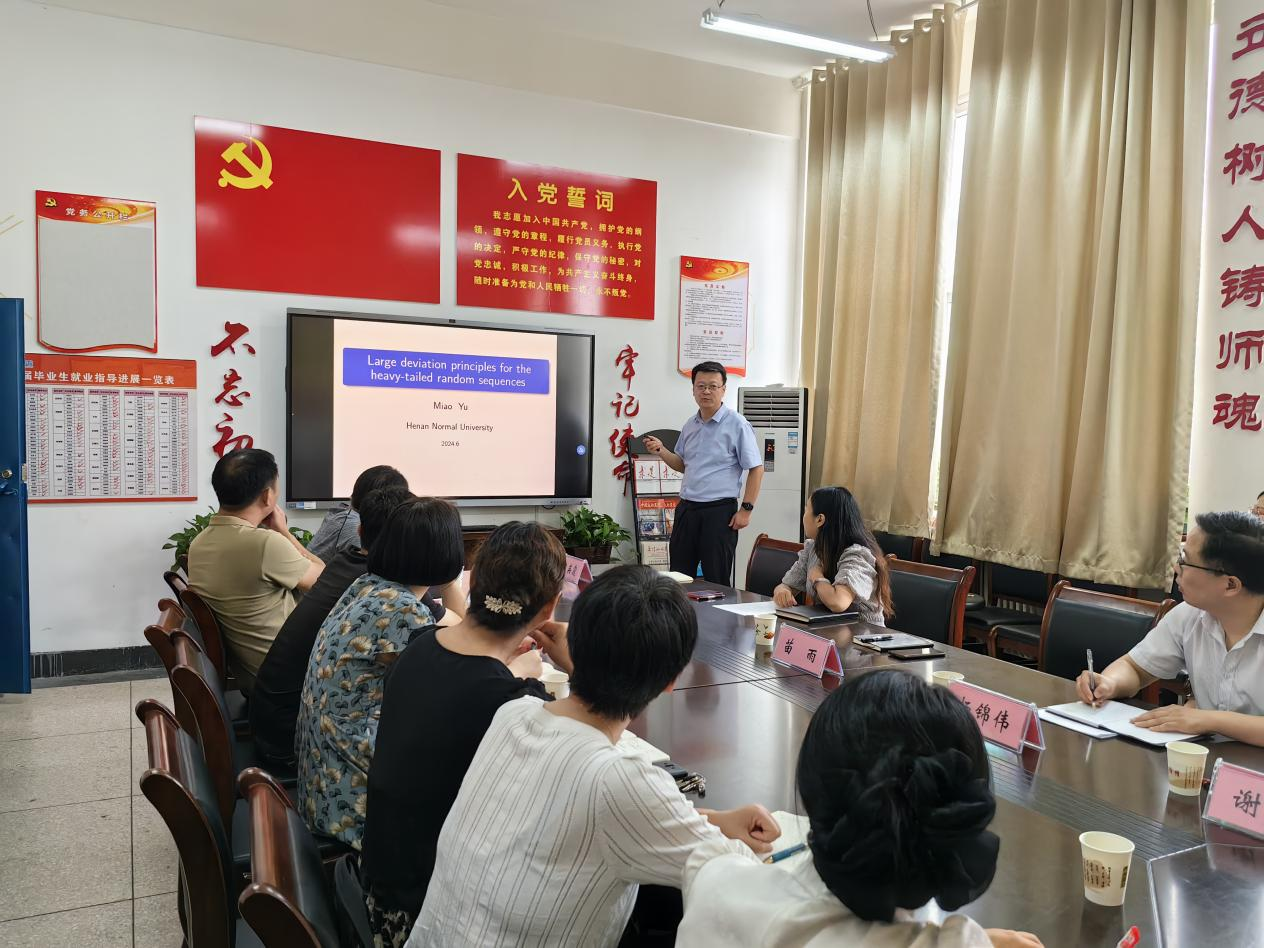 6月28日下午,河南师范大学苗雨教授在2317会议室作了一场主题为“Large deviation principles for the heavy-tailed random sequences”的学术报告,报告由信誉最好的十大体育平台经理王俊俊主持,统计学教研室相关教师参加。